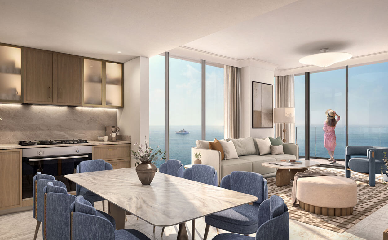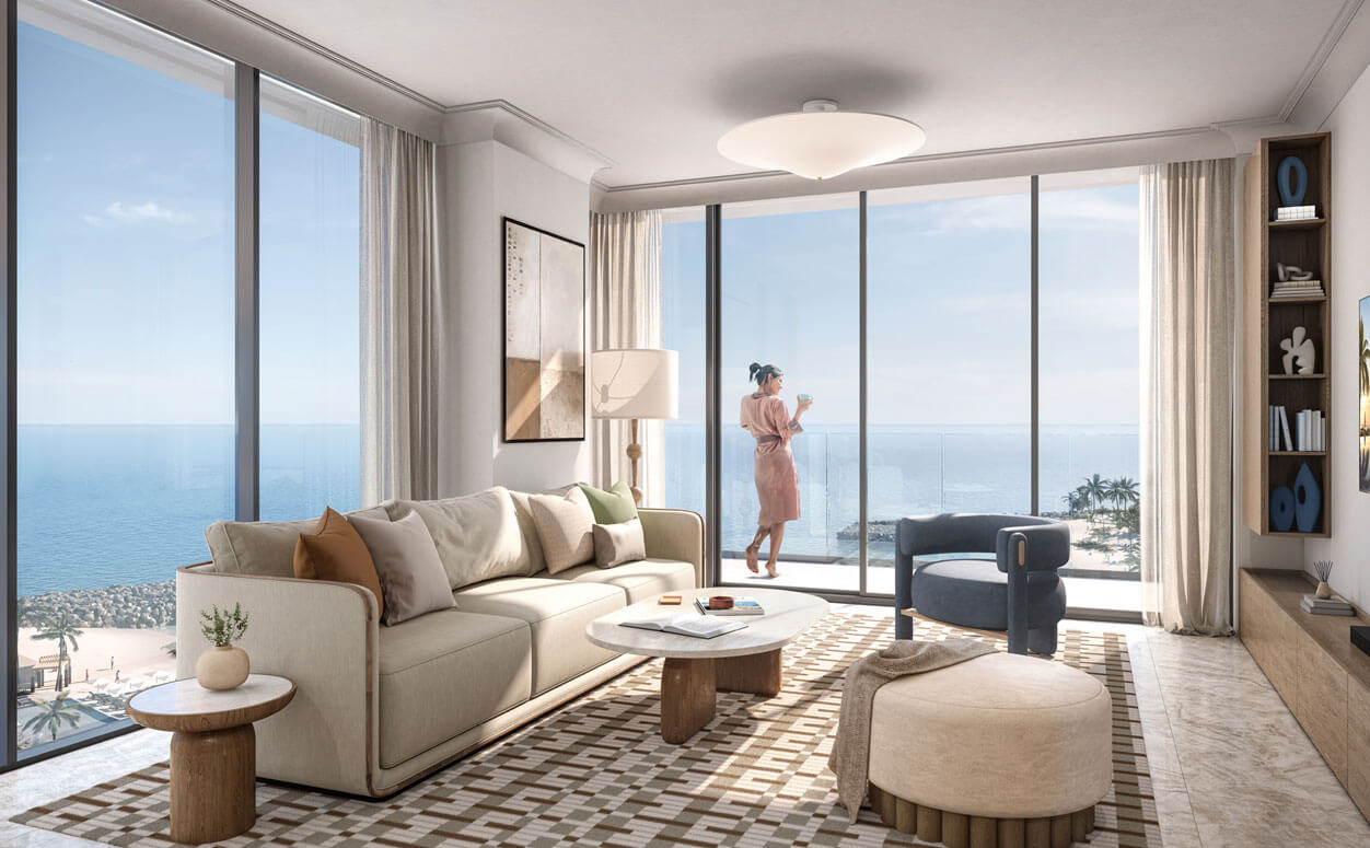 Address Al Marjan Island is a place where serenity and elegance coexist. A tranquil sanctuary defined by the spaces' neutral colors, elegant furniture, and natural light. The comfort of the inside is enhanced by the breathtaking views of the sky and sea that are invited by the floor to-ceiling windows. The island's opulent way of life is reflected in every detail, from the modern fixtures to the carefully chosen lighting.